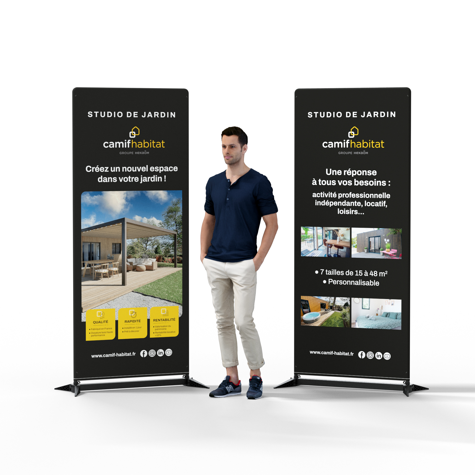 Fond de stand de 3×2,3m personnalisé Camif HABITAT recto/verso.